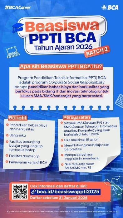Pendaftaran Beasiswa BCA PPTI batch 2 dibuka hingga 31 Januari 2026. Program ini ditujukan bagi siswa kelas 12 SMA jurusan IPA, lulusan SMA, serta alumni SMK jurusan Teknologi Informatika atau Ilmu Komputer yang akan melanjutkan pendidikan pada 2026.