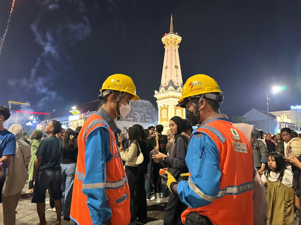 Namun di balik hiruk-pikuk keramaian itu, dua orang beratribut PLN lengkap tengah bersiaga. Mereka adalah Afif dan Yuda, Petugas Pelayanan Teknik PLN Unit Layanan Pelanggan (ULP) Yogyakarta Kota yang bertugas menjaga keandalan kelistrikan di lokasi Tugu Yogyakarta.