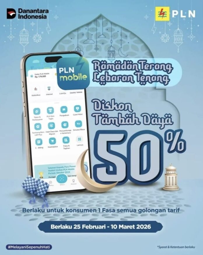 Promo tersebut berlaku mulai 25 Februari hingga 10 Maret 2026. Pelanggan dapat mengajukan penambahan daya secara praktis melalui aplikasi PLN Mobile tanpa harus datang ke kantor PLN.