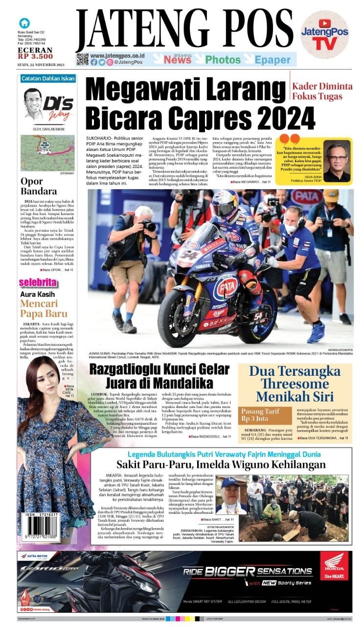 Epaper E-Paper Koran Jateng Pos, 22 November 2021 Admin: Jamilah Senin, 22 November 2021 @06:26 TERKINI Sekda Berharap Pusat Perbanyak Event Nasional di JatengSabtu, 25 April 2026 @15:58 Progresif Dalam Penanganan Stunting, Ahmad Luthfi Raih National Governance Award 2026 Sabtu, 25 April 2026 @15:43 Sekda Jateng Bicara Manfaat Olahraga untuk Veteran : Kebersamaan, Kesehatan, dan... Sabtu, 25 April 2026 @13:29 Berkah Setia Farm Jadi Percontohan Lumbung Ternak Jateng Sabtu, 25 April 2026 @13:26 Bank Jateng Ukir Prestasi, Anna Kusumarita Raih The Most Outstanding Women... Sabtu, 25 April 2026 @11:16 Rekomendasi... E-Paper Koran Jateng Pos, Selasa 23 Juli...Selasa, 23 Juli 2024 @09:01 E-Paper Koran Jateng Pos, Jumat 17 Mei...Jumat, 17 Mei 2024 @09:05 E-Paper Koran Jateng Pos, Rabu 12 Juni...Rabu, 12 Juni 2024 @22:47 E-Paper Koran Jateng Pos, 17 September 2024Selasa, 17 September 2024 @07:43 E-Paper Koran Jateng Pos, Selasa 16 Agustus...Selasa, 16 Agustus 2022 @10:44 E-Paper Koran Jateng Pos, Selasa 06 November...Selasa, 5 November 2024 @14:32