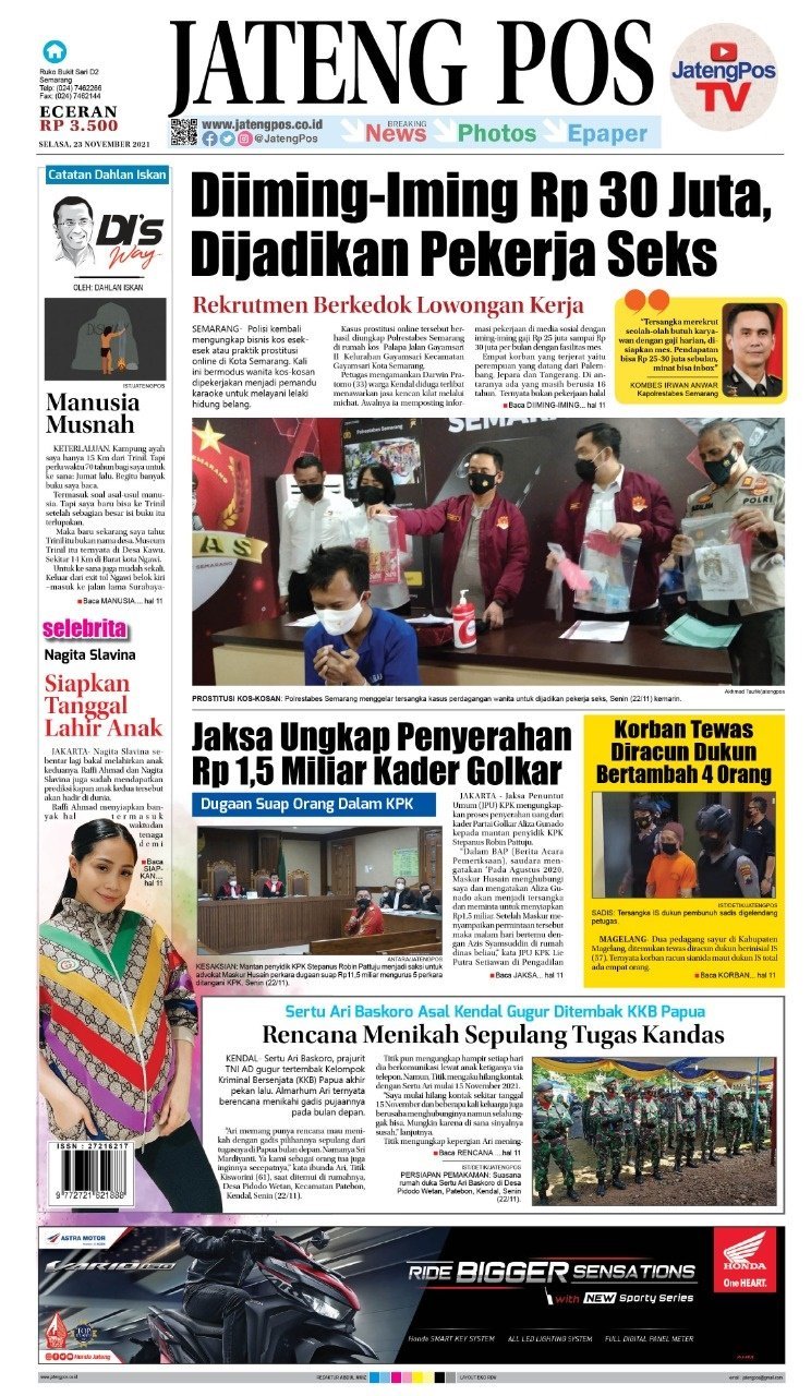 Epaper E-Paper Koran Jateng Pos, 23 November 2021 Admin: Jamilah Selasa, 23 November 2021 @06:24 TERKINI Sekda Berharap Pusat Perbanyak Event Nasional di JatengSabtu, 25 April 2026 @15:58 Progresif Dalam Penanganan Stunting, Ahmad Luthfi Raih National Governance Award 2026 Sabtu, 25 April 2026 @15:43 Sekda Jateng Bicara Manfaat Olahraga untuk Veteran : Kebersamaan, Kesehatan, dan... Sabtu, 25 April 2026 @13:29 Berkah Setia Farm Jadi Percontohan Lumbung Ternak Jateng Sabtu, 25 April 2026 @13:26 Bank Jateng Ukir Prestasi, Anna Kusumarita Raih The Most Outstanding Women... Sabtu, 25 April 2026 @11:16 Rekomendasi... Headline Koran Jateng Pos, Jumat 15 Agustus...Jumat, 15 Agustus 2025 @09:13 E-Paper Koran Jateng Pos, Selasa , 18...Selasa, 18 Maret 2025 @06:11 E-Paper Koran Jateng Pos, Rabu 18 Oktober...Rabu, 18 Oktober 2023 @08:38 E-Paper Koran Jateng Pos, Rabu 13 Maret...Rabu, 13 Maret 2024 @06:48 E-Paper Jateng Pos, 3 Agustus 2021Selasa, 3 Agustus 2021 @14:04 E-Paper Koran Jateng Pos, 16 Desember 2021Kamis, 16 Desember 2021 @06:02