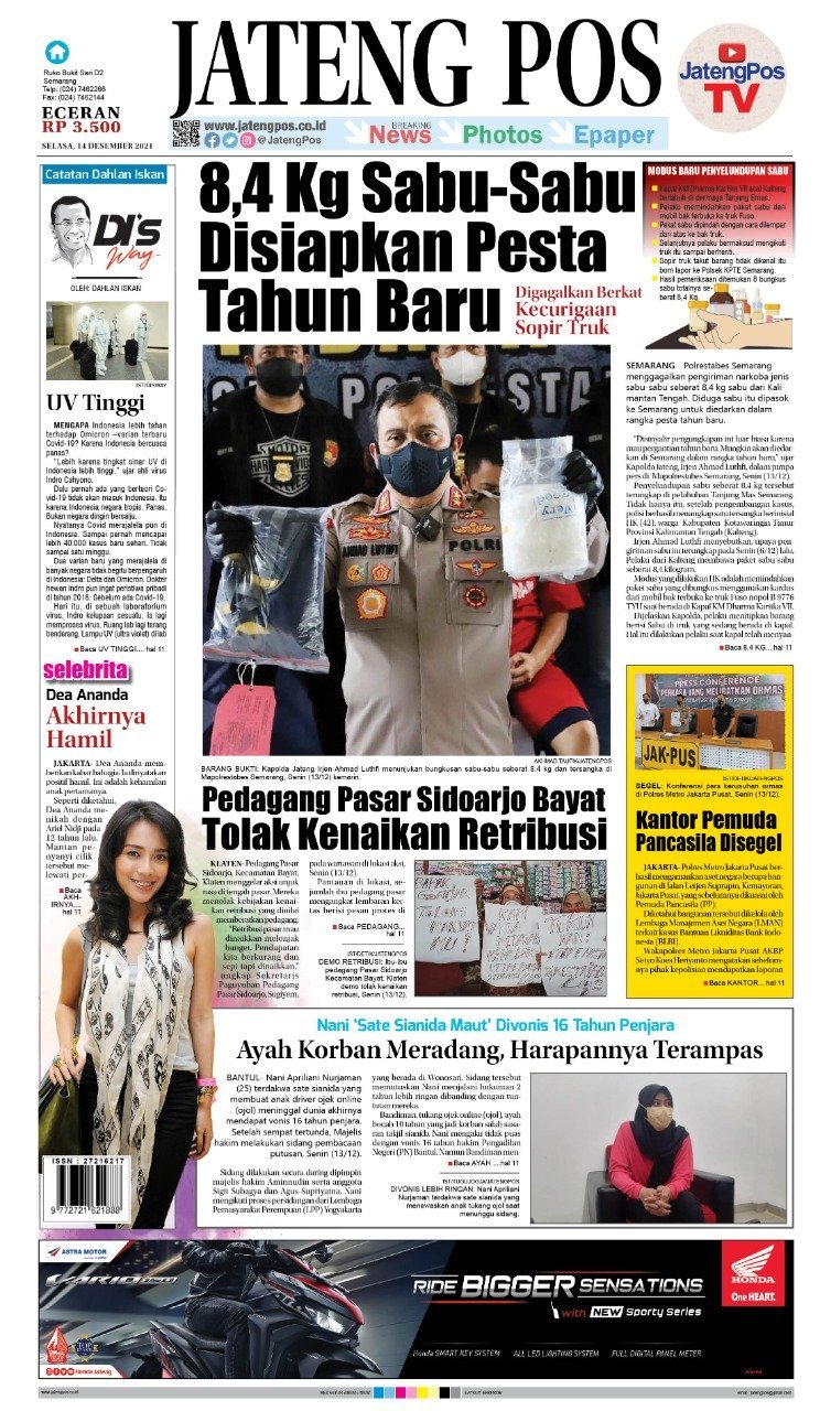 Epaper E-Paper Koran Jateng Pos, 14 Desember 2021 Admin: Jamilah Selasa, 14 Desember 2021 @06:57 TERKINI Danamon Hadirkan Program Mudik Gratis, Perkuat Semangat Ramadan Lebih BerkahRabu, 18 Maret 2026 @22:02 Pantau Posko Mudik, Wali kota Agustina Wilujeng Pastikan Pelayanan Berjalan Lancar Rabu, 18 Maret 2026 @21:54 Libur Lebaran, PDAM Pastikan Pelayanan Air Lancar Rabu, 18 Maret 2026 @21:53 Nunung Sriyanto Dorong Mahasiswa Ikut Awasi MBG Rabu, 18 Maret 2026 @21:48 Wajar Mobil Dinas Beroperasi, Sebagian ASN Pemkot Semarang Tetap Bertugas, Meski... Rabu, 18 Maret 2026 @21:48 Rekomendasi... E-Paper Koran Jateng Pos, Rabu 18 Juli...Kamis, 18 Juli 2024 @08:03 E-Paper Koran Jateng Pos, Minggu 26 Juni...Minggu, 26 Juni 2022 @06:27 E-Paper Koran Jateng Pos, 17 September 2024Selasa, 17 September 2024 @07:43 E-Paper Koran Jateng Pos, 11 Maret 2023Sabtu, 11 Maret 2023 @08:16 E-Paper Koran Jateng Pos, 04 Maret 2022Jumat, 4 Maret 2022 @08:02 E-Paper Koran Jateng Pos, Kamis 09 Juni...Kamis, 9 Juni 2022 @06:42