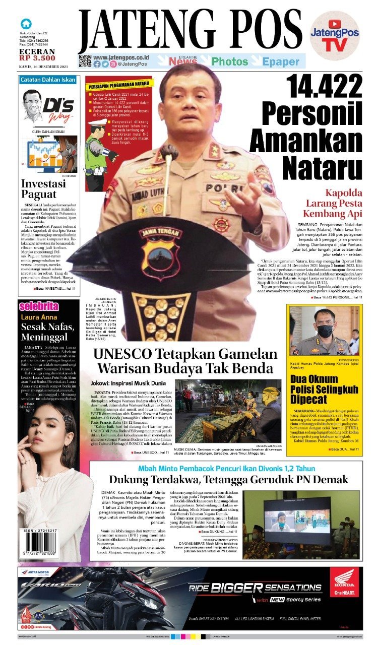 Epaper E-Paper Koran Jateng Pos, 16 Desember 2021 Admin: Jamilah Kamis, 16 Desember 2021 @06:02 TERKINI Sekda Berharap Pusat Perbanyak Event Nasional di JatengSabtu, 25 April 2026 @15:58 Progresif Dalam Penanganan Stunting, Ahmad Luthfi Raih National Governance Award 2026 Sabtu, 25 April 2026 @15:43 Sekda Jateng Bicara Manfaat Olahraga untuk Veteran : Kebersamaan, Kesehatan, dan... Sabtu, 25 April 2026 @13:29 Berkah Setia Farm Jadi Percontohan Lumbung Ternak Jateng Sabtu, 25 April 2026 @13:26 Bank Jateng Ukir Prestasi, Anna Kusumarita Raih The Most Outstanding Women... Sabtu, 25 April 2026 @11:16 Rekomendasi... E-Paper Koran Jateng Pos, Edisi 2 Oktober...Senin, 2 Oktober 2023 @08:07 E-Paper Koran Jateng Pos, Rabu 15 Juni...Rabu, 15 Juni 2022 @07:14 E-Paper Koran Jateng Pos, 14 Februari 2023Selasa, 14 Februari 2023 @07:34 E-Paper Koran Jateng Pos, Selasa 29 Oktober...Selasa, 29 Oktober 2024 @06:16 E-Paper Koran Jateng Pos, 09 Januari 2022Minggu, 9 Januari 2022 @08:23 E-Paper Koran Jateng Pos, 20 Februari 2022Minggu, 20 Februari 2022 @07:12