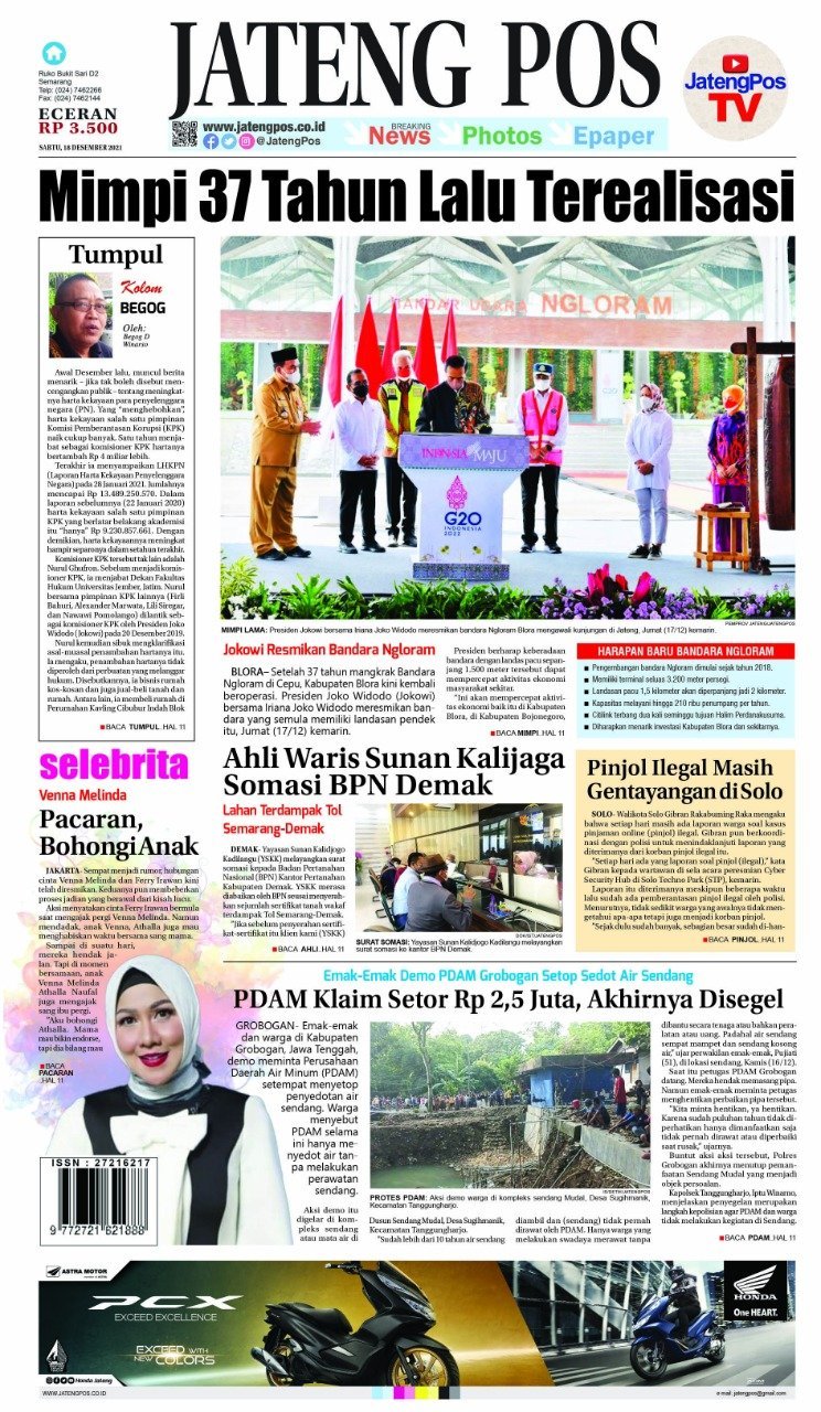 Epaper E-Paper Koran Jateng Pos, 18 Desember 2021 Admin: Jamilah Sabtu, 18 Desember 2021 @06:05 TERKINI Gubernur Ahmad Luthfi Pantau Langsung THR Buruh: Hak Pekerja Wajib Cair H-7 LebaranSelasa, 10 Maret 2026 @22:04 Di Era Viral dan Hoaks, Wagub Jateng Minta Santri Produksi Konten... Selasa, 10 Maret 2026 @22:01 Tol Bawen-Ambarawa Dibuka Fungsional Saat Mudik Lebaran Selasa, 10 Maret 2026 @16:49 Sambut Arus Mudik Lebaran 2026, Polda Jateng Siapkan Strategi Pengendalian Wilayah Selasa, 10 Maret 2026 @16:48 Exit Tol Bawen Rawan Kecelakaan Selasa, 10 Maret 2026 @16:46 Rekomendasi... E-Paper Koran Jateng Pos, Rabu 22 November...Rabu, 22 November 2023 @06:55 E-Paper Koran Jateng Pos, Selasa 4 Juni...Selasa, 4 Juni 2024 @22:26 E-Paper Koran Jateng Pos, 06 Februari 2022Minggu, 6 Februari 2022 @08:55 E-Paper Koran Jateng, Senin 04 November 2024Senin, 4 November 2024 @06:51 E-Paper Koran Jateng Pos, Senin 22 Mei...Senin, 22 Mei 2023 @08:50 E-Paper Koran Jateng Pos, Rabu 7 Juni...Rabu, 7 Juni 2023 @07:58