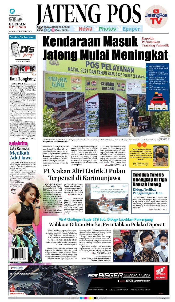 Epaper E-Paper Koran Jateng Pos, 23 Desember 2021 Admin: Jamilah Kamis, 23 Desember 2021 @07:37 TERKINI Waspada! Mudik Lebaran 2026 Berpotensi Dibayangi Cuaca EkstremJumat, 20 Februari 2026 @21:22 Berkat Kerja-Kerja Kolaboratif, Pembangunan Jawa Tengah Menunjukkan Tren Positif Jumat, 20 Februari 2026 @21:16 Bubur Samin Jayengan, Tradisi WBTB yang Merekatkan Solo Jumat, 20 Februari 2026 @16:30 Satu Tahun Rober – Adhe, Jalan Bebas Jeglongan Hingga Digitalisasi jadi... Jumat, 20 Februari 2026 @16:26 Tiga Pria Ditangkap Polisi Terkait Narkoba Jumat, 20 Februari 2026 @16:24 Rekomendasi... E-Paper Koran Jateng Pos, Kamis 18 Agustus...Kamis, 18 Agustus 2022 @11:17 E-Paper Jateng Pos, 14 Agustus 2021Sabtu, 14 Agustus 2021 @10:02 E-Paper Koran Jateng Pos, 01 Oktober 2021Jumat, 1 Oktober 2021 @07:41 E-Paper Koran Jateng Pos, Selasa 15 April...Selasa, 15 April 2025 @06:30 E-Paper Koran Jateng Pos, 12 September 2023Selasa, 12 September 2023 @20:12 Koran Jateng Pos, Edisi Selasa 29 Juli...Selasa, 29 Juli 2025 @05:10