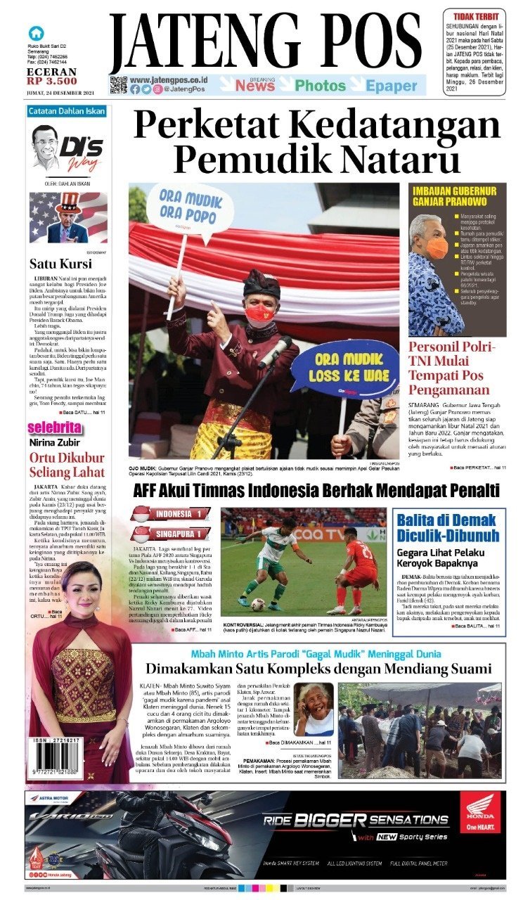 Epaper E-Paper Koran Jateng Pos, 24 Desember 2021 Admin: Jamilah Jumat, 24 Desember 2021 @08:47 TERKINI Gangguan Instalasi di Gardu Induk Jajar, Pasokan Listrik di Solo Selama Idul Fitri Tetap AmanSelasa, 17 Maret 2026 @13:06 Libur Lebaran, Latar Lawu Glamping Tawangmangu Siapkan Privat Pool Selasa, 17 Maret 2026 @12:35 Mengharukan, Pemudik Hidrosefalus Asal Sukoharjo dapat Layanan Istimewa Selasa, 17 Maret 2026 @09:39 Pemkot Semarang Fasilitasi Mudik Gratis Bagi Warganya dari Jakarta ke Kota... Selasa, 17 Maret 2026 @09:28 Pemkot Semarang Dirikan Posko Kemanusiaan Lebaran 2026, Layani Pemudik dengan Fasilitas... Selasa, 17 Maret 2026 @09:28 Rekomendasi... E-Paper Koran Jateng Pos, Jumat 24 Januari...Jumat, 24 Januari 2025 @08:35 E-Paper Koran Jateng Pos, Kamis 16 Juni...Kamis, 16 Juni 2022 @07:16 E-Paper Koran Jateng Pos, 10 Desember 2021Jumat, 10 Desember 2021 @06:50 E-Paper Jateng Pos, 29 Agustus 2021Sabtu, 28 Agustus 2021 @21:28 E-Paper Koran Jateng Pos, Senin 22 Agustus...Senin, 22 Agustus 2022 @08:50 E-Paper Koran Jateng Pos, 22 November 2021Senin, 22 November 2021 @06:26