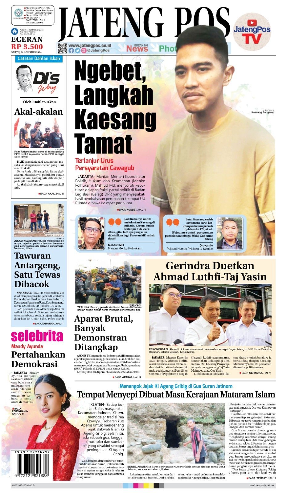 Epaper E-Paper Koran Jateng Pos, Sabtu 24 Agustus 2024 Admin: Redaksi Sabtu, 24 Agustus 2024 @07:13 Kaesang Tamat Kaesang Tamat TERKINI Laga Hidup Mati di EtihadSelasa, 17 Maret 2026 @14:44 Gangguan Instalasi di Gardu Induk Jajar, Pasokan Listrik di Solo Selama... Selasa, 17 Maret 2026 @13:06 Libur Lebaran, Latar Lawu Glamping Tawangmangu Siapkan Privat Pool Selasa, 17 Maret 2026 @12:35 Mengharukan, Pemudik Hidrosefalus Asal Sukoharjo dapat Layanan Istimewa Selasa, 17 Maret 2026 @09:39 Pemkot Semarang Fasilitasi Mudik Gratis Bagi Warganya dari Jakarta ke Kota... Selasa, 17 Maret 2026 @09:28 Rekomendasi... E-Paper Koran Jateng Pos, Rabu 21 Agustus...Rabu, 21 Agustus 2024 @07:05 E-Paper Koran Jateng Pos, Jumat 24 Juni...Jumat, 24 Juni 2022 @08:10 E-Paper Koran Jateng Pos, Rabu 30 Oktober...Rabu, 30 Oktober 2024 @06:34 E-Paper Jateng Pos, 28 Agutus 2021Sabtu, 28 Agustus 2021 @05:55 E-Paper Koran Jateng Pos, Kamis 18 April...Kamis, 18 April 2024 @22:28 E-Paper Kortan Jateng Pos, Selasa 12 Maret...Selasa, 12 Maret 2024 @10:22