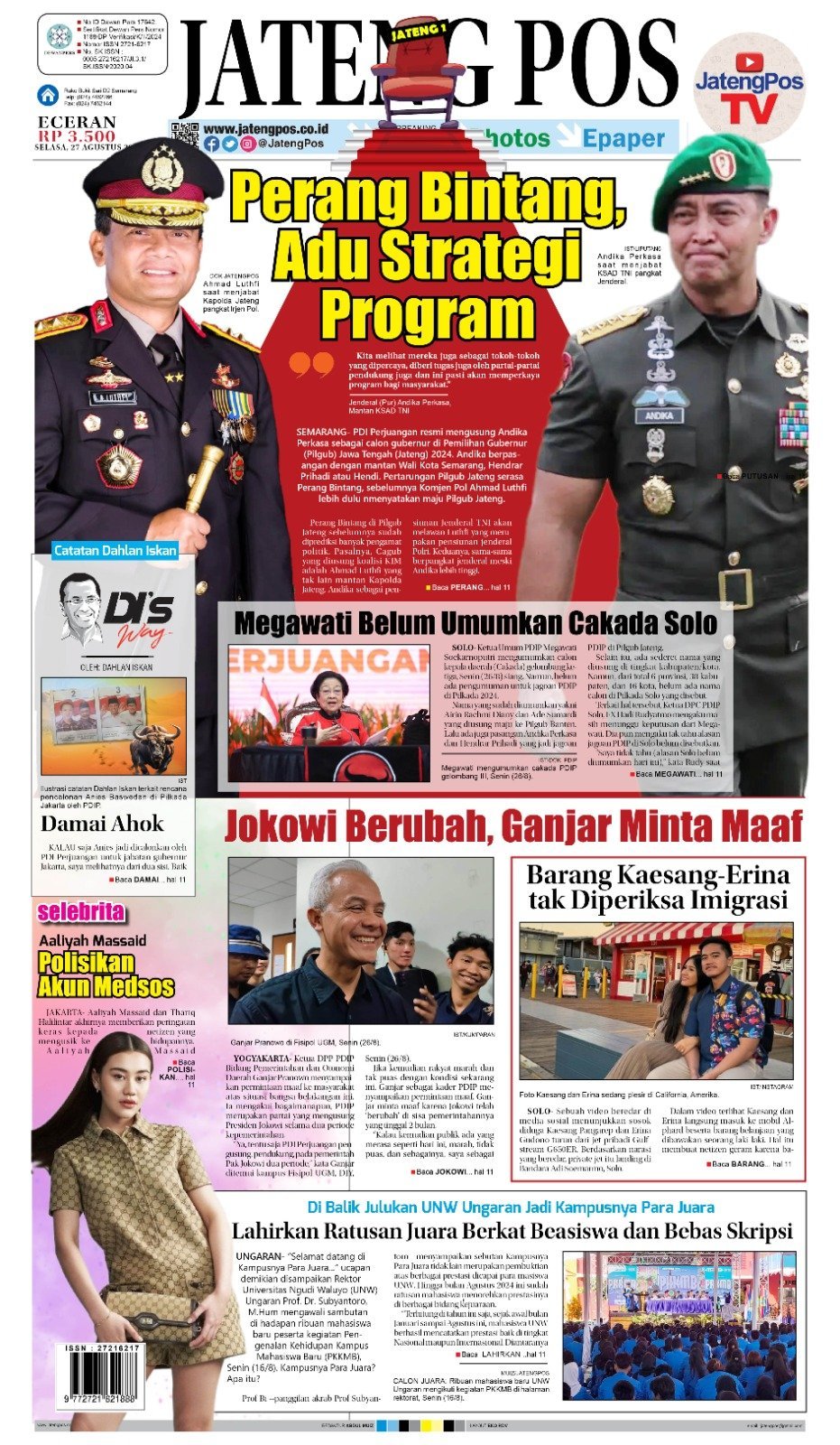 Epaper E-Paper Koran Jateng Pos, Selasa 27 Agustus 2024 Admin: Redaksi Selasa, 27 Agustus 2024 @06:00 TERKINI Nadya Bridal Rayakan Keindahan Plus Size di Ikapesta 2026Sabtu, 24 Januari 2026 @23:46 Ancaman Pidana hingga Insentif PBB, Strategi Pemprov Jateng Jaga Sawah Sabtu, 24 Januari 2026 @20:51 Nawal Yasin Minta JMQH Perkuat Pembinaan Perempuan Penghafal Al-Qur’an Sabtu, 24 Januari 2026 @20:48 Cegah Banjir, Wagub Taj Yasin Minta Masyarakat Perbanyak Biopori Sabtu, 24 Januari 2026 @20:43 Srikandi PLN Hadirkan Ruang Cerita Ibu Sabtu, 24 Januari 2026 @06:27 Rekomendasi... E-Paper Jateng Pos, 26 Agustus 2021Kamis, 26 Agustus 2021 @05:40 Headline Koran Jateng Pos, Kamis 04 Desember...Kamis, 4 Desember 2025 @07:08 E-Paper Koran Jateng Pos, Kamis 15 Juni...Kamis, 15 Juni 2023 @08:04 E-Paper Jateng Pos, 20 Agustus 2021Kamis, 19 Agustus 2021 @22:08 E-Paper Koran Jateng Pos, 17 September 2024Selasa, 17 September 2024 @07:43 E-Paper Koran Jateng Pos, Rabu 14 Juni...Rabu, 14 Juni 2023 @06:38