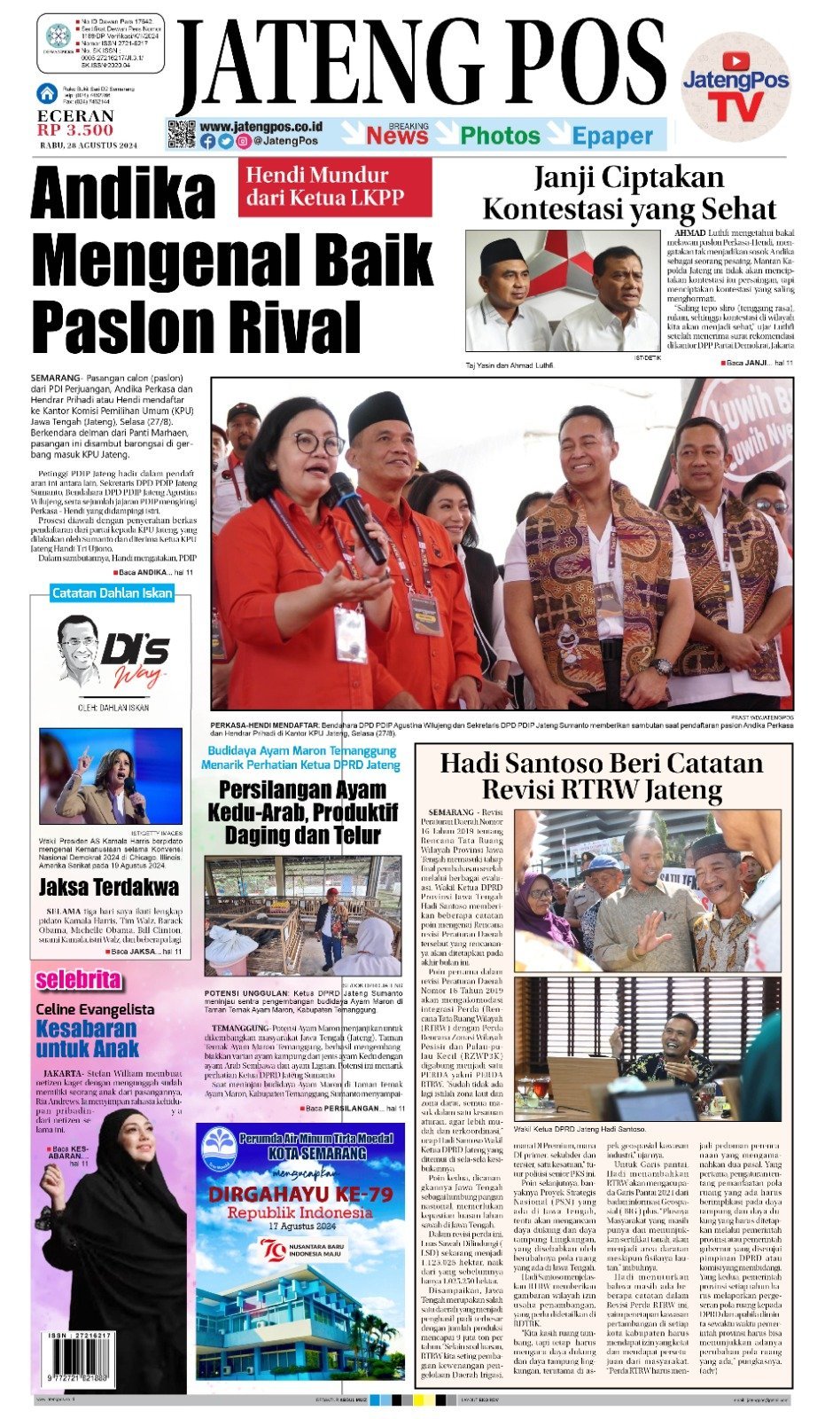 Epaper E-Paper Koran Jateng Pos, Rabu 28 Agustus 2024 Admin: Redaksi Rabu, 28 Agustus 2024 @07:19 TERKINI Sekda Berharap Pusat Perbanyak Event Nasional di JatengSabtu, 25 April 2026 @15:58 Progresif Dalam Penanganan Stunting, Ahmad Luthfi Raih National Governance Award 2026 Sabtu, 25 April 2026 @15:43 Sekda Jateng Bicara Manfaat Olahraga untuk Veteran : Kebersamaan, Kesehatan, dan... Sabtu, 25 April 2026 @13:29 Berkah Setia Farm Jadi Percontohan Lumbung Ternak Jateng Sabtu, 25 April 2026 @13:26 Bank Jateng Ukir Prestasi, Anna Kusumarita Raih The Most Outstanding Women... Sabtu, 25 April 2026 @11:16 Rekomendasi... E-Paper Koran Jateng Pos, Rabu 14 Juni...Rabu, 14 Juni 2023 @06:38 E-Paper Koran Jateng Pos, Senin 27 November...Senin, 27 November 2023 @06:08 E-Paper Koran Jateng Pos, Jumat 26 April...Jumat, 26 April 2024 @09:14 Headline Koran Jateng Pos, Senin 15 September...Senin, 15 September 2025 @05:48 E-Paper Koran Jateng Pos, 12 Januari 2023Kamis, 12 Januari 2023 @07:08 E-Paper Koran Jateng Pos, 29 Januari 2022Sabtu, 29 Januari 2022 @08:27