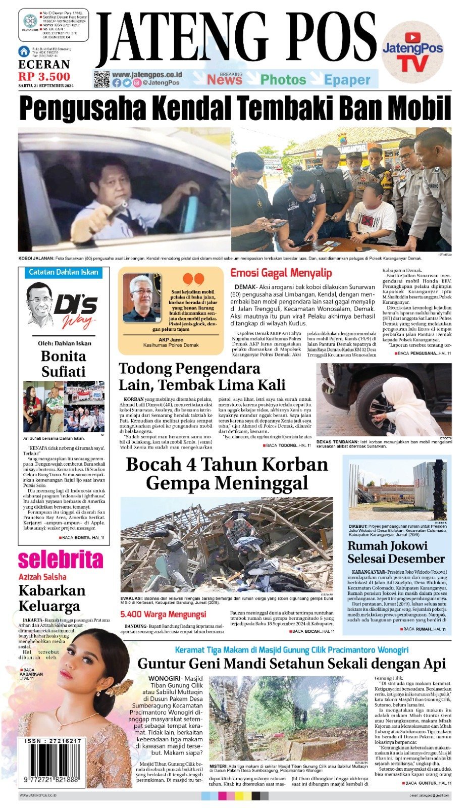 Epaper E-Paper Koran Jateng Pos, Sabtu 21 September 2024 Admin: Redaksi Sabtu, 21 September 2024 @07:02 TERKINI Ahmad Luthfi Pimpin Penanaman Jutaan Bibit Mangrove Secara Serentak, Catatkan Rekor MuriRabu, 15 Oktober 2025 @12:46 Gubernur Jateng Raih Rekor MURI Pimpin Penanaman 1,9 Juta Mangrove Serentak Rabu, 15 Oktober 2025 @12:14 Dengan Semangat Kesaktian Pancasila, PLN UP3 Magelang Jaga Keandalan Listrik di... Rabu, 15 Oktober 2025 @11:39 Bupati Klaten Serahkan JKM dan Beasiswa Rp186 Juta Rabu, 15 Oktober 2025 @11:31 Cegah Keracunan MBG, Guru di Karanganyar Membuat Aplikasi Deteksi Dini Makanan Rabu, 15 Oktober 2025 @10:38 Rekomendasi... E-Paper Koran Jateng Pos, Sabtu 06 Juli...Sabtu, 6 Juli 2024 @07:02 E-Paper Koran Jateng Pos, Jumat 26 April...Jumat, 26 April 2024 @09:14 E-Paper Koran Jateng Pos, Jumat 19 Agustus...Jumat, 19 Agustus 2022 @10:50 E-Paper Koran Jateng Pos, 11 Januari 2022Selasa, 11 Januari 2022 @08:19 E-Paper Koran Jateng Pos, Kamis 7 Maret...Kamis, 7 Maret 2024 @07:07 E-Paper Jateng Pos, 14 Agustus 2021Sabtu, 14 Agustus 2021 @10:02