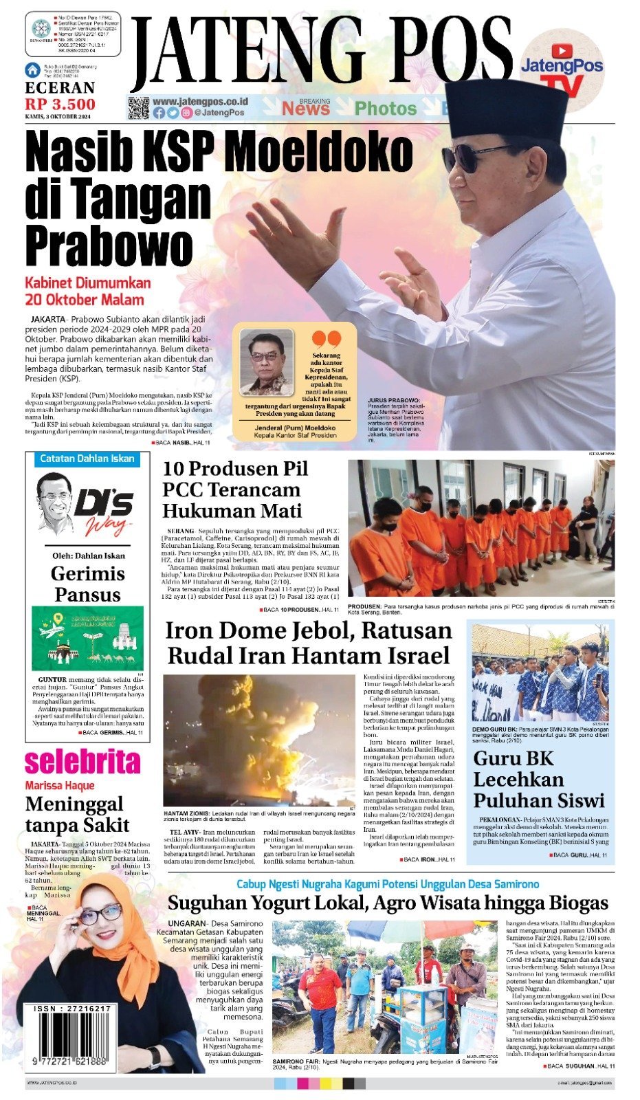Epaper E-Paper Koran Jateng Pos, Kamis 03 September 2024 Admin: Redaksi Kamis, 3 Oktober 2024 @08:47 TagsE-Paper Koran Jateng Pos TERKINI Sekda Berharap Pusat Perbanyak Event Nasional di JatengSabtu, 25 April 2026 @15:58 Progresif Dalam Penanganan Stunting, Ahmad Luthfi Raih National Governance Award 2026 Sabtu, 25 April 2026 @15:43 Sekda Jateng Bicara Manfaat Olahraga untuk Veteran : Kebersamaan, Kesehatan, dan... Sabtu, 25 April 2026 @13:29 Berkah Setia Farm Jadi Percontohan Lumbung Ternak Jateng Sabtu, 25 April 2026 @13:26 Bank Jateng Ukir Prestasi, Anna Kusumarita Raih The Most Outstanding Women... Sabtu, 25 April 2026 @11:16 Rekomendasi... E-Paper Jateng Pos, 12 Agustus 2021Rabu, 11 Agustus 2021 @21:31 E-Paper Koran Jateng Pos, 12 Desember 2021Minggu, 12 Desember 2021 @06:53 Headline Koran Jateng Pos, Sabtu 15 November...Sabtu, 15 November 2025 @07:11 Headline Koran Jateng Pos, Selasa 01 Oktober...Rabu, 1 Oktober 2025 @07:39 E-Paper Koran Jateng Pos, Senin 01 Juli...Senin, 1 Juli 2024 @07:36 E-Paper Koran Jateng Pos, Sabtu 31 Agustus...Sabtu, 31 Agustus 2024 @09:15