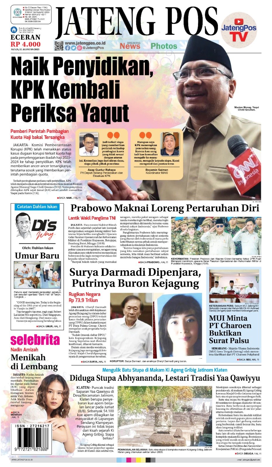 Epaper Headline Koran Jateng Pos, 11 Agustus 2025 Admin: yasin Senin, 11 Agustus 2025 @05:56 TagsYaqut Cholil Qoumas TERKINI Gubernur Ahmad Luthfi Pantau Langsung THR Buruh: Hak Pekerja Wajib Cair H-7 LebaranSelasa, 10 Maret 2026 @22:04 Di Era Viral dan Hoaks, Wagub Jateng Minta Santri Produksi Konten... Selasa, 10 Maret 2026 @22:01 Tol Bawen-Ambarawa Dibuka Fungsional Saat Mudik Lebaran Selasa, 10 Maret 2026 @16:49 Sambut Arus Mudik Lebaran 2026, Polda Jateng Siapkan Strategi Pengendalian Wilayah Selasa, 10 Maret 2026 @16:48 Exit Tol Bawen Rawan Kecelakaan Selasa, 10 Maret 2026 @16:46 Rekomendasi... Headline Koran Jateng Pos, Sabtu 20 September...Sabtu, 20 September 2025 @06:38 E-Paper Koran Jateng Pos, Rabu 31 Agustus...Rabu, 31 Agustus 2022 @07:29 E-Paper Koran Jateng Pos, Sabtu 13 Mei...Sabtu, 13 Mei 2023 @07:55 E-Paper Jateng Pos, 6 September 2021Senin, 6 September 2021 @11:23 E-Paper Koran Jateng Pos, 24 Januari 2022Senin, 24 Januari 2022 @06:31 E-Paper Koran Jateng Pos, Kamis 29 Agustus...Kamis, 29 Agustus 2024 @08:42