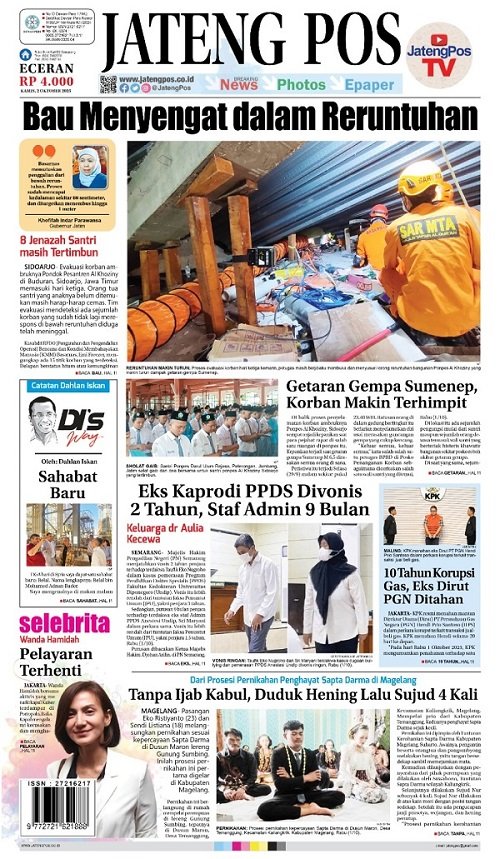 Epaper Headline Koran Jateng Pos, Kamis 02 September 2025 Admin: yasin Kamis, 2 Oktober 2025 @05:17 TagsMushola Ponpes Al Khozily TERKINI Nadya Bridal Rayakan Keindahan Plus Size di Ikapesta 2026Sabtu, 24 Januari 2026 @23:46 Ancaman Pidana hingga Insentif PBB, Strategi Pemprov Jateng Jaga Sawah Sabtu, 24 Januari 2026 @20:51 Nawal Yasin Minta JMQH Perkuat Pembinaan Perempuan Penghafal Al-Qur’an Sabtu, 24 Januari 2026 @20:48 Cegah Banjir, Wagub Taj Yasin Minta Masyarakat Perbanyak Biopori Sabtu, 24 Januari 2026 @20:43 Srikandi PLN Hadirkan Ruang Cerita Ibu Sabtu, 24 Januari 2026 @06:27 Rekomendasi... E-Paper Koran Jateng Pos, Kamis 18 Agustus...Kamis, 18 Agustus 2022 @11:17 E-Paper Koran Jateng Pos, 08 Oktober 2021Jumat, 8 Oktober 2021 @07:38 E-Paper Koran Jateng Pos, 22 Februari 2022Selasa, 22 Februari 2022 @06:22 E-Paper Koran Jateng Pos, 14 Desember 2021Selasa, 14 Desember 2021 @06:57 E-Paper Jateng Pos, 19 Agustus 2021Rabu, 18 Agustus 2021 @22:04 E-Paper Koran Jateng Pos, 22 Januari 2022Sabtu, 22 Januari 2022 @08:07