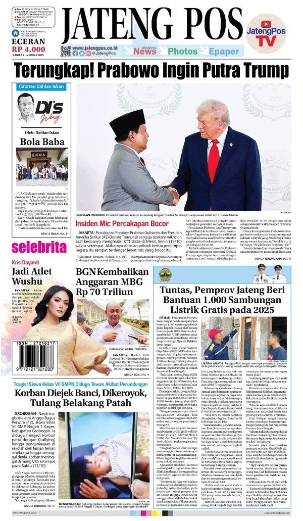 Epaper Headline Koran Jateng Pos, Rabu 15 Oktober 2025 Admin: yasin Rabu, 15 Oktober 2025 @06:25 TERKINI Sekda Berharap Pusat Perbanyak Event Nasional di JatengSabtu, 25 April 2026 @15:58 Progresif Dalam Penanganan Stunting, Ahmad Luthfi Raih National Governance Award 2026 Sabtu, 25 April 2026 @15:43 Sekda Jateng Bicara Manfaat Olahraga untuk Veteran : Kebersamaan, Kesehatan, dan... Sabtu, 25 April 2026 @13:29 Berkah Setia Farm Jadi Percontohan Lumbung Ternak Jateng Sabtu, 25 April 2026 @13:26 Bank Jateng Ukir Prestasi, Anna Kusumarita Raih The Most Outstanding Women... Sabtu, 25 April 2026 @11:16 Rekomendasi... E-Paper Koran Jateng Pos, Edisi 27 Maret...Senin, 27 Maret 2023 @06:23 E-Paper Koran Jateng Pos, Sabtu 18 Juni...Sabtu, 18 Juni 2022 @07:18 E-Paper Koran Jateng Pos, Kamis 10 September...Kamis, 10 Oktober 2024 @08:10 E-Paper Koran Jateng Pos, 14 Januari 2022Jumat, 14 Januari 2022 @08:11 E-Paper Koran Jateng Pos, Sabtu 18 November...Sabtu, 18 November 2023 @06:01 E-Paper Koran Jateng Pos, 20 Januari 2022Kamis, 20 Januari 2022 @07:04