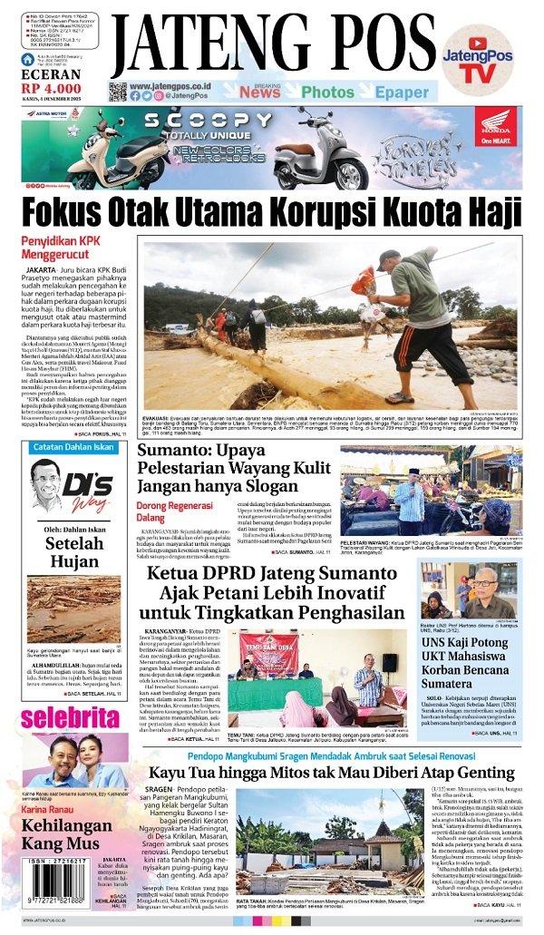 Epaper Headline Koran Jateng Pos, Kamis 04 Desember 2025 Admin: yasin Kamis, 4 Desember 2025 @07:08 TERKINI Ketua Satgas MBG Kudus Ambil Sikap Tegas, Bellinda: Semua Dapur Harus Seragam !Jumat, 30 Januari 2026 @17:45 Lima Kadinas Hasil Selter Dilantik, BKPSDM Tunggu Surat Dirjen Dukcapil Jumat, 30 Januari 2026 @17:39 Perkuat Layanan Informasi Publik, Lantik Direktur Radio Jumat, 30 Januari 2026 @17:37 Polres Kudus Bersihkan Sekolah Pasca Banjir Jumat, 30 Januari 2026 @17:35 Hasil Uji Lab Keracunan MBG Keluar Lima Hari Lagi Jumat, 30 Januari 2026 @17:32 Rekomendasi... E-Paper Koran Jateng Pos, Jumat 2 Juni...Jumat, 2 Juni 2023 @05:35 E-Paper Koran Jateng Pos, 21 November 2021Minggu, 21 November 2021 @06:28 E-Paper Koran Jateng Pos, Selasa 16 Agustus...Selasa, 16 Agustus 2022 @10:44 E-Paper Jateng Pos, 26 Agustus 2021Kamis, 26 Agustus 2021 @05:40 E-Paper Koran Jateng Pos, 07 Januari 2022Jumat, 7 Januari 2022 @08:27 Headline Koran Jateng Pos, Jumat 17 Oktober...Jumat, 17 Oktober 2025 @05:58