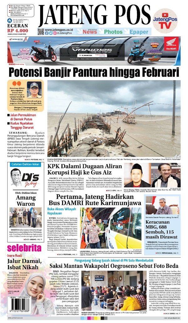 Epaper Headline Koran Jateng Pos, Rabu 14 Januari 2026 Admin: yasin Rabu, 14 Januari 2026 @05:29 TERKINI Perkuat Sinergi, Bank Jateng Bantu Mobil Operasional Pemda BrebesRabu, 14 Januari 2026 @10:14 Uswah Hasanah KH Chafidz Sulaiman: Menjaga Amanah Orang Tua Rabu, 14 Januari 2026 @08:26 John Herdman Akan Bawa Garuda Terbang Tinggi Rabu, 14 Januari 2026 @08:01 Babak Baru Sengkarut Ijazah Jokowi, KIP Perintahkan KPU Gelar Terbuka Rabu, 14 Januari 2026 @07:34 Laga Ujian Liam Rosenior Rabu, 14 Januari 2026 @06:59 Rekomendasi... E-Paper Koran Jateng Pos, Edisi 29 Maret...Rabu, 29 Maret 2023 @06:19 E-Paper Koran Jateng Pos, 02 Maret 2022Rabu, 2 Maret 2022 @08:16 Headline Koran Jateng Pos, Kamis 16 Oktober...Kamis, 16 Oktober 2025 @06:14 E-Paper Jateng Pos, 31 Januari 2022Senin, 31 Januari 2022 @06:50 E-Paper Koran Jateng Pos, Senin 29 Agustus...Senin, 29 Agustus 2022 @05:06 E-Paper Koran Jateng Pos, Kamis 25 Januari...Kamis, 25 Januari 2024 @08:16