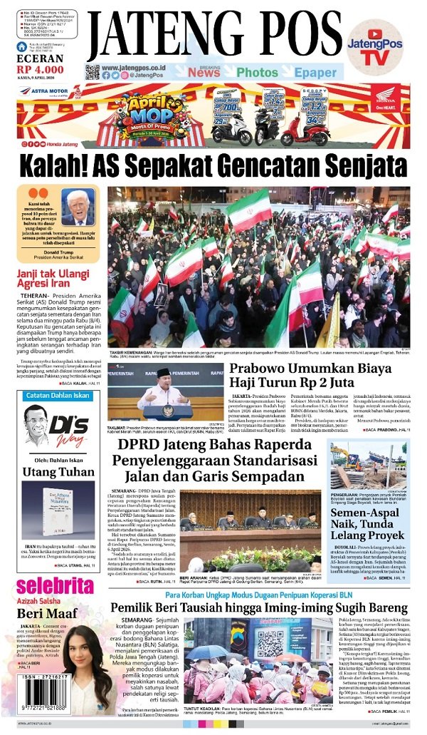 Epaper Headline Koran Jateng Pos, Kamis 9 April 2026 Admin: yasin Kamis, 9 April 2026 @06:45 TagsHeadline Koran Jateng PosKamis 9 April 2026 TERKINI DPRD Jateng Bahas Raperda Penyelenggaraan Standarisasi Jalan dan Garis SempadanRabu, 8 April 2026 @20:34 Hadapi Kemarau, Ahmad Luthfi Perintahkan Cek Seluruh Embung dan Irigasi di... Rabu, 8 April 2026 @20:07 Horee! Pemprov Jateng Gratiskan Bea Balik Nama Kendaraan Bekas Rabu, 8 April 2026 @20:01 TIM PKM FH USM BERI PENYULUHAN PENCEGAHAN KEKERASAN BERBASIS GENDER DALAM... Rabu, 8 April 2026 @19:50 Belum Kantongi SLHS-IPAL, SPPG Samben Dekat Kandang Ayam Diminta Tutup Rabu, 8 April 2026 @16:31 Rekomendasi... E-Paper Koran Jateng Pos, Sabtu 03 Agustus...Sabtu, 3 Agustus 2024 @08:18 E-Paper Koran Jateng Pos, 22 November 2021Senin, 22 November 2021 @06:26 E-Paper Jateng Pos, 23 September 2021Kamis, 23 September 2021 @06:27 E-Paper Koran Jateng Pos, Kamis 12 September...Kamis, 12 September 2024 @07:40 E-Paper Koran Jateng Pos, Rabu 22 Juni...Rabu, 22 Juni 2022 @06:33 E-Paper Jateng Pos, 16 September 2021Kamis, 16 September 2021 @08:32