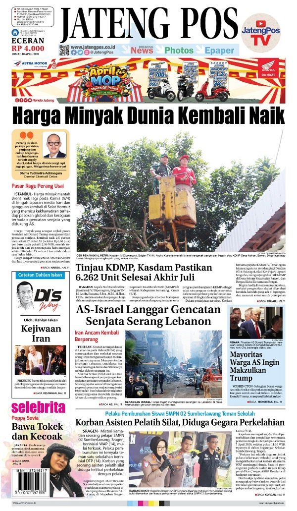 Epaper Headline Koran Jateng Pos, Jumat 10 April 2026 Admin: yasin Jumat, 10 April 2026 @06:42 TagsHeadline Koran Jateng PosJumat 10 April 2026 TERKINI Tiga Desa Kabupaten Semarang Diusulkan Maju Penilaian Statistik Tingkat NasionalKamis, 9 April 2026 @20:30 Tinjau KDMP di Kabupaten Semarang, Kasdam IV/Diponegoro Pastikan 6.262 Unit Selesai... Kamis, 9 April 2026 @17:09 PGN Group Borong PROPER Emas dan Hijau, Bukti Konsistensi Inovasi Lingkungan Kamis, 9 April 2026 @16:03 Kisah Wagub Jateng “Membocorkan” Nama Aslinya Kamis, 9 April 2026 @15:52 Presiden Prabowo Puji Gubernur Jateng Kamis, 9 April 2026 @15:49 Rekomendasi... E-Paper Koran Jateng Pos, 05 Oktober 2021Selasa, 5 Oktober 2021 @09:05 Headline Koran Jateng Pos, Kamis 04 Desember...Kamis, 4 Desember 2025 @07:08 E-Paper Jateng Pos, 21 Agustus 2021Jumat, 20 Agustus 2021 @21:49 E-Paper Koran Jateng Pos, 27 Desember 2021Senin, 27 Desember 2021 @08:59 E-Paper Koran Jateng Pos, 14 Maret 2023Selasa, 14 Maret 2023 @08:09 Headline Koran Jateng Pos, Selasa 12 Agustus...Selasa, 12 Agustus 2025 @07:44