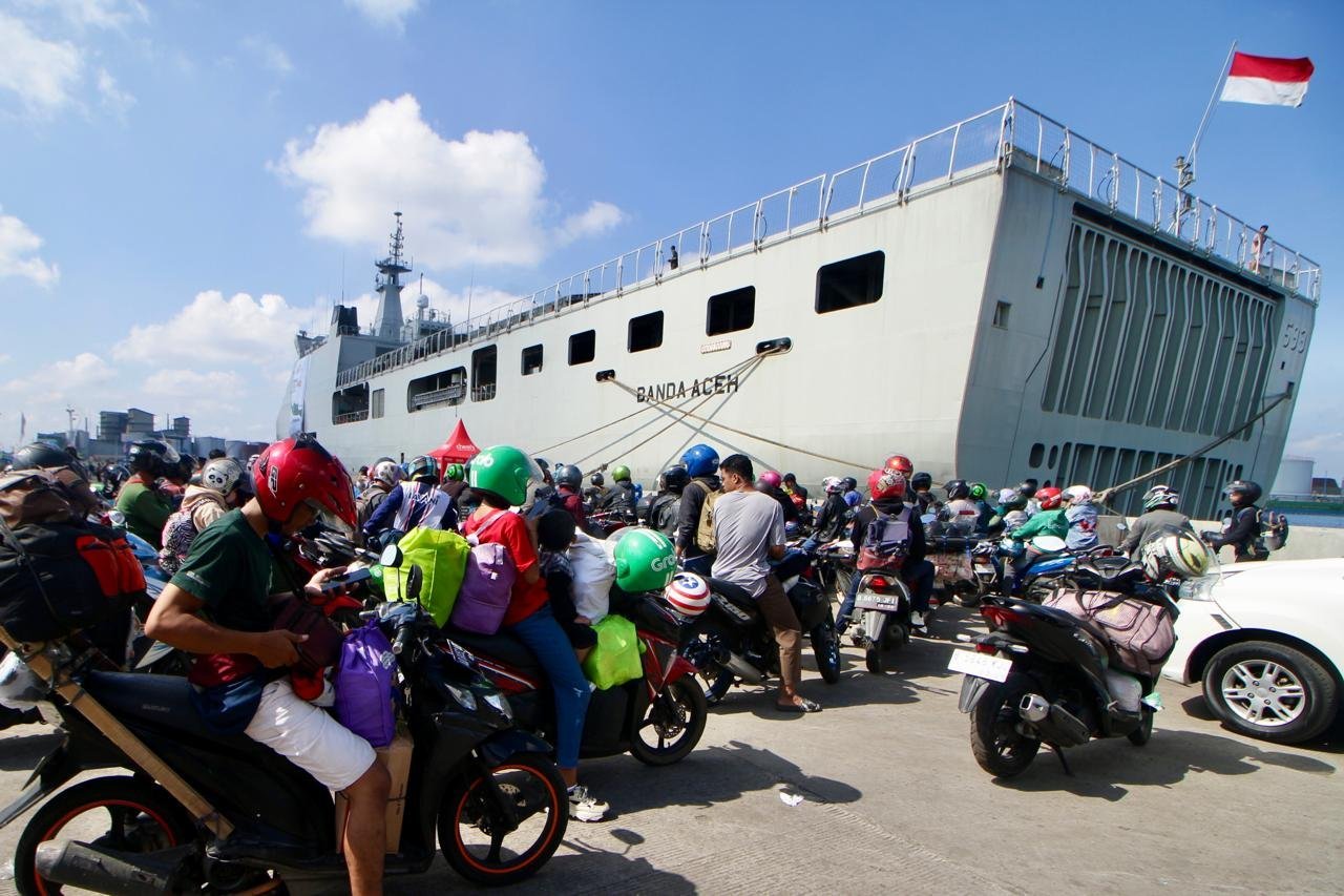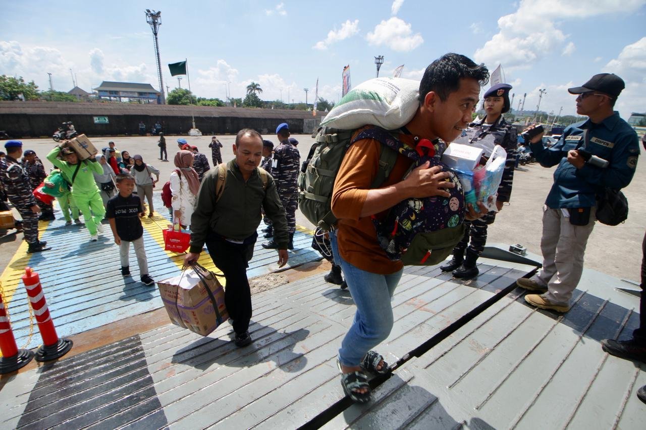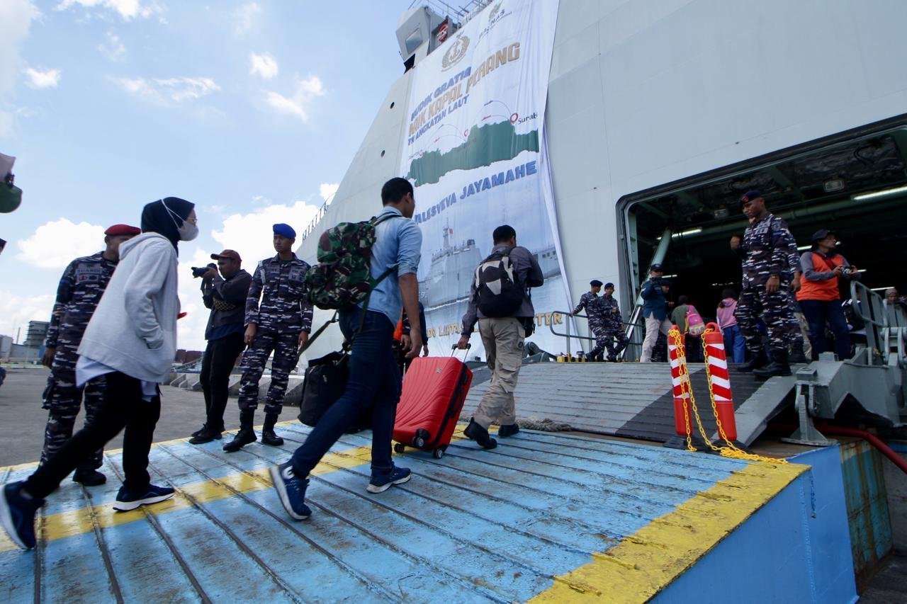 JATENGPOS.CO.ID, SEMARANG – Pemudik Balik memasuki Kapal KRI Banda Aceh-593 (KRI BAC-593) di Pelabuhan Tanjung Mas Semarang, Minggu (14/4/24). TNI Angkatan Laut menyediakan program mudik untuk arus balik gratis bagi masyarakat dengan menggunakan kapal perang yang berangkat dari Surabaya dan Semarang menuju Jakarta.