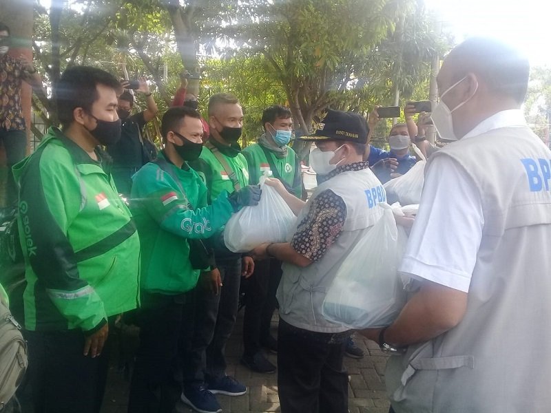 JATENGPOS.CO.ID. UNGARAN- Bupati Semarang H Ngesti Nugraha membagikan paket sembako kepada para pedagang kaki lima (PKL) dan pengemudi ojek online (ojol) yang mangkal di sekitar rumah dinas Bupati Semarang di Ungaran, Sabtu (31/7/2021).