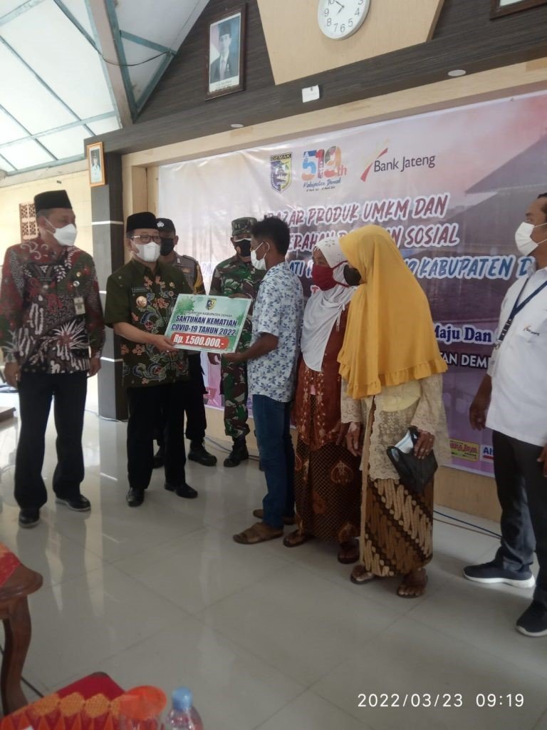 Pada kesempatan itu, selain membuka bazar wakil bupati Ali Makhsun juga memberikan bantuan sosial kepada masyarakat kurang mampu dan terdampak pandemic covid-19 di wilayah Kecamatan Dempet. Bantuan yang diberikan santunan kematian sebesar Rp 1,5 juta kepada warga miskin yang anggota keluarganya meninggal karena covid -19. Selain itu juga diberikan paket bantuan social kepada warga miskin dan membutuhkan.