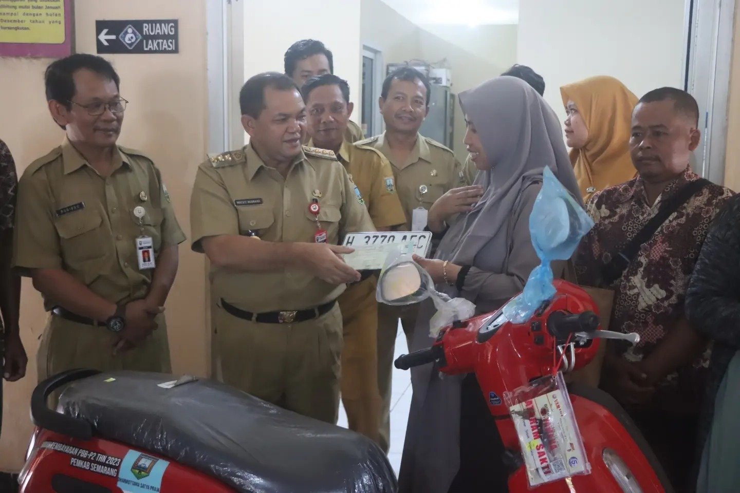 JATENGPOS.CO.ID, UNGARAN– Inilah hari mujur Masyitoh, pedagang nasi gudangan di Lopait, Tuntang. Dia menerima hadiah sebuah sepeda motor dari Bupati Semarang H Ngesti Nugraha karena patuh membayar pajak bumi dan bangunan (PBB) 20l23 sebelum jatuh tempo.