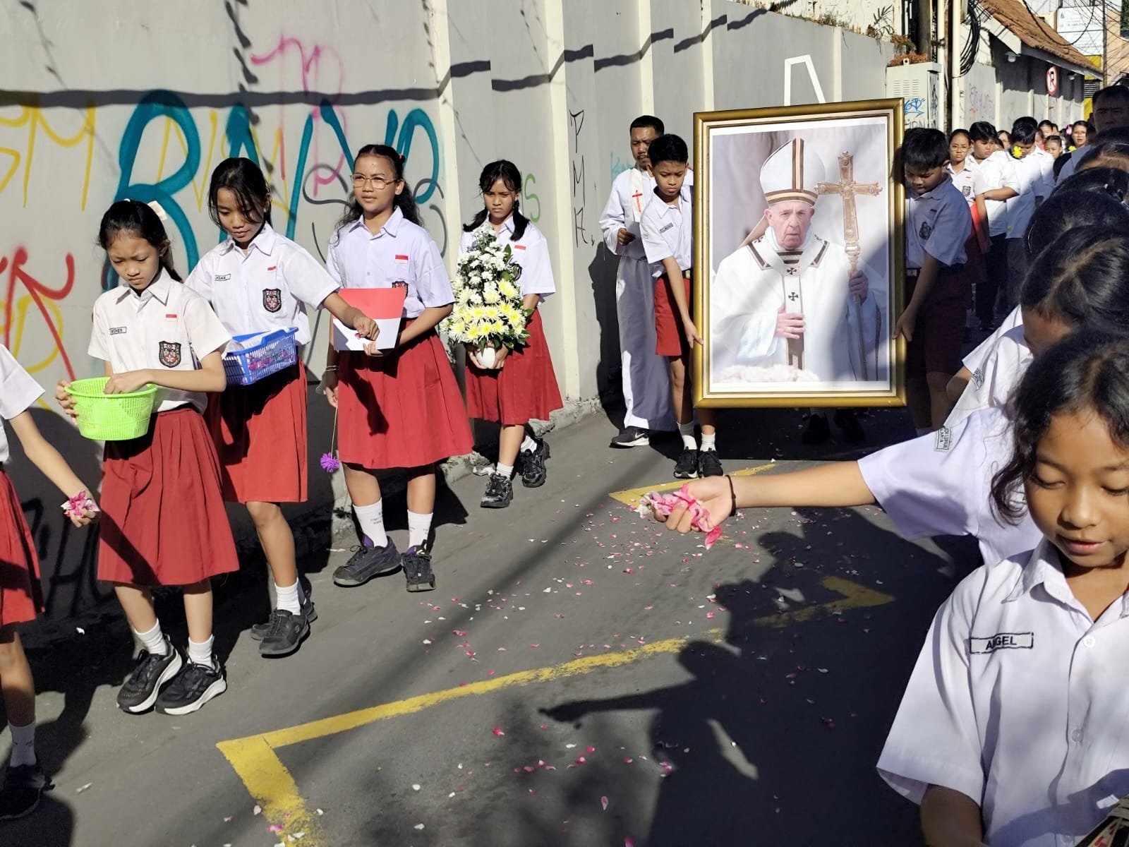Perarakan dimulai dari sekolah menuju Gereja St. Antonius Purbayan, diiringi lagu-lagu berkabung oleh tim koor sekolah. Dua siswa membawa foto besar Bapa Paus Fransiskus di bagian depan, bersama Bruder Andrias Purwanto FIC—Koordinator SD Pangudi Luhur Solo—serta dua prodiakon.