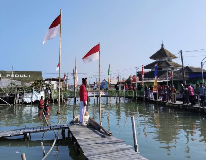 JATENGPOS.CO.ID DEMAK – Genangan rob yang tak kunjung surut tak menyurutkan semangat warga Dukuh Timbulsloko, Kecamatan Sayung, Kabupaten Demak, untuk merayakan Hari Ulang Tahun ke-80 Kemerdekaan Republik Indonesia. Dengan panggung kayu sederhana di atas lahan yang kini tergenang air laut, masyarakat setempat menggelar Upacara Rakyat pada Minggu (17/8/2025).