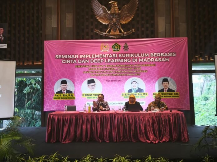JATENGPOS.CO.ID, WONOSOBO — Guru madrasah didorong untuk tidak hanya melek digital, tetapi juga menghadirkan cinta dalam setiap proses belajar. Pesan ini disampaikan dalam seminar “Implementasi Kurikulum Berbasis Cinta dan Deep Learning di Madrasah” yang diselenggarakan Direktorat Guru dan Tenaga Kependidikan Madrasah Ditjen Pendidikan Islam Kemenag RI bekerja sama dengan UIN Walisongo, di Kabupaten Wonosobo, Rabu (15/10/2025). Hadir sebagai narasumber Wibowo Prasetyo, Anggota DPR RI Komisi VIII, dan Maslikhah, Wakil Dekan FTKI UIN Salatiga.