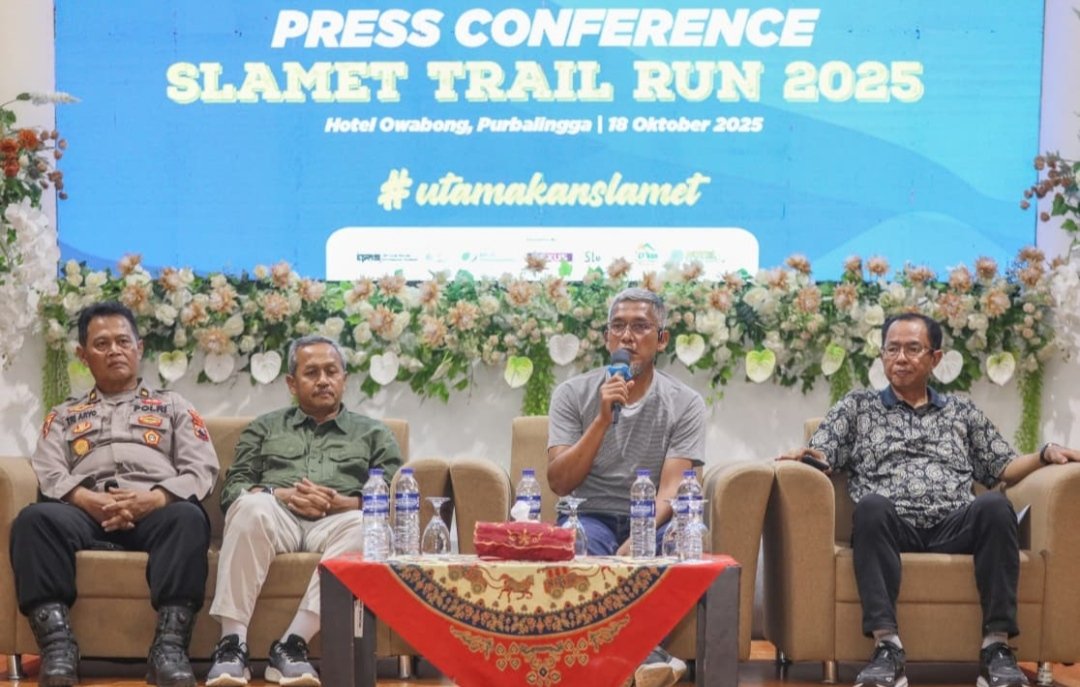 Konferensi pers Slamet Trail Run 2025 di Ruang Andrawina, Hotel Owabong, Kabupaten Purbalingga, Sabtu, 18 Oktober 2025.