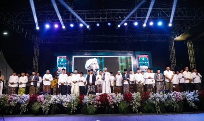 JATENGPOS. CO. ID, KUDUS – Ribuan santri dan jamaah tetap memadati Alun-Alun Kabupaten Kudus, Selasa malam, 21 Oktober 2025, mengikuti acara “Jateng Bersholawat” meski hujan mengguyur sejak awal. Kegiatan ini digelar dalam rangka memperingati Hari Santri Nasional 2025 dengan tema “Mengawal Indonesia Merdeka, Menuju Peradaban Dunia.”