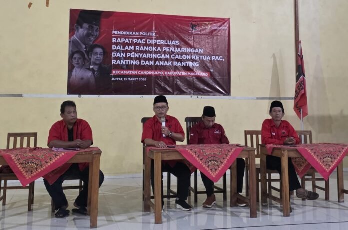 JATENGPOS.CO.ID, MAGELANG – Suasana penuh semangat terasa dalam agenda Rapat Pengurus Anak Cabang (PAC) PDI Perjuangan yang diperluas yang digelar di Kecamatan Candimulyo, Kabupaten Magelang, Minggu (15/3/2026). Dalam yang menjadi ajang penjaringan dan penyaringan calon Ketua PAC, ranting, hingga anak ranting itu, ratusan kader berkumpul dengan semangat gotong royong dan kekompakan.