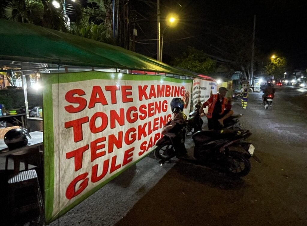 Sate tenda ini menyediakan sate kambing, tongseng, tengkleng, dan gule sapi. Yang hobi kepala kambing, babat, dan tulang juga ada.