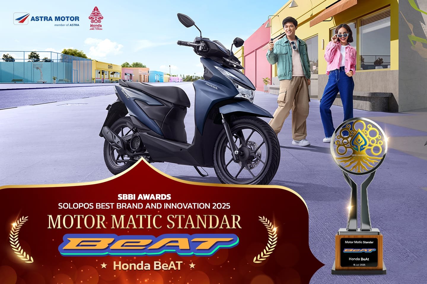 “Popularitas Honda BeAT yang selaras dengan angka penjualannya sebagai skutik terlaris kembali dibuktikan melalui penghargaan ini. Terima kasih atas kepercayaan masyarakat Jawa Tengah, dan apresiasi kami kepada Aksara Solopos atas penyelenggaraan SBBI Award,” ujar Ronaldo Widjaja, Region Head Astra Motor Jawa Tengah.