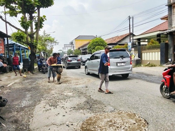 Gotong royong menjadi kunci utama dalam upaya penambalan lubang-lubang yang membahayakan pengendara.