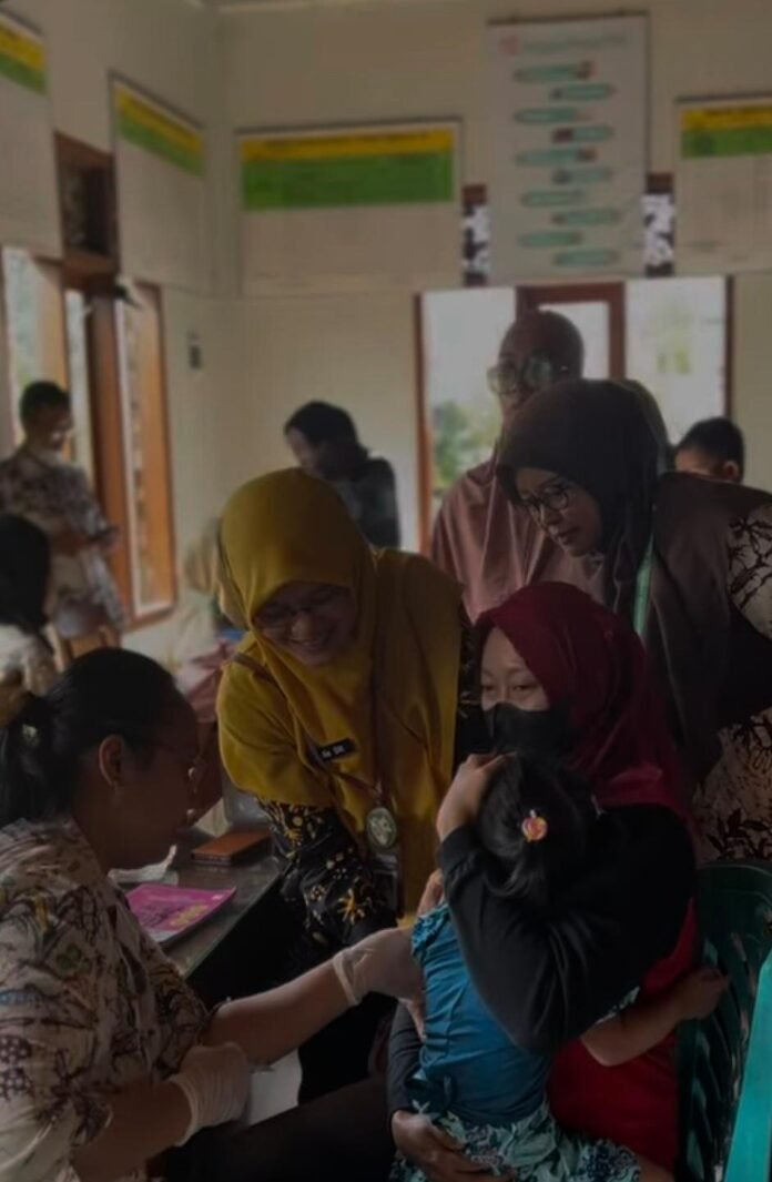 Salah satu orang tua, Antin, turut mengikuti vaksinasi campak di Balai Desa Jambean Kidul. Ia khawatir dengan adanya kasus campak di desanya dan berharap putrinya dapat terlindungi dengan antibodi yang baik dan kuat.