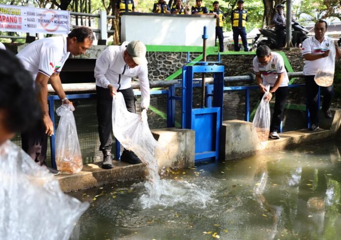 JATENGPOS.CO.ID, KUDUS – Bupati Kudus, Sam’ani Intakoris, melakukan terobosan unik dalam menjaga kebersihan lingkungan, sekaligus menciptakan ruang hiburan bagi masyarakat. Menyusul penebaran bibit ikan nila, di saluran air depan Kantor Dinas Pertanian dan Pangan Kabupaten Kudus, Jumat (10/4).