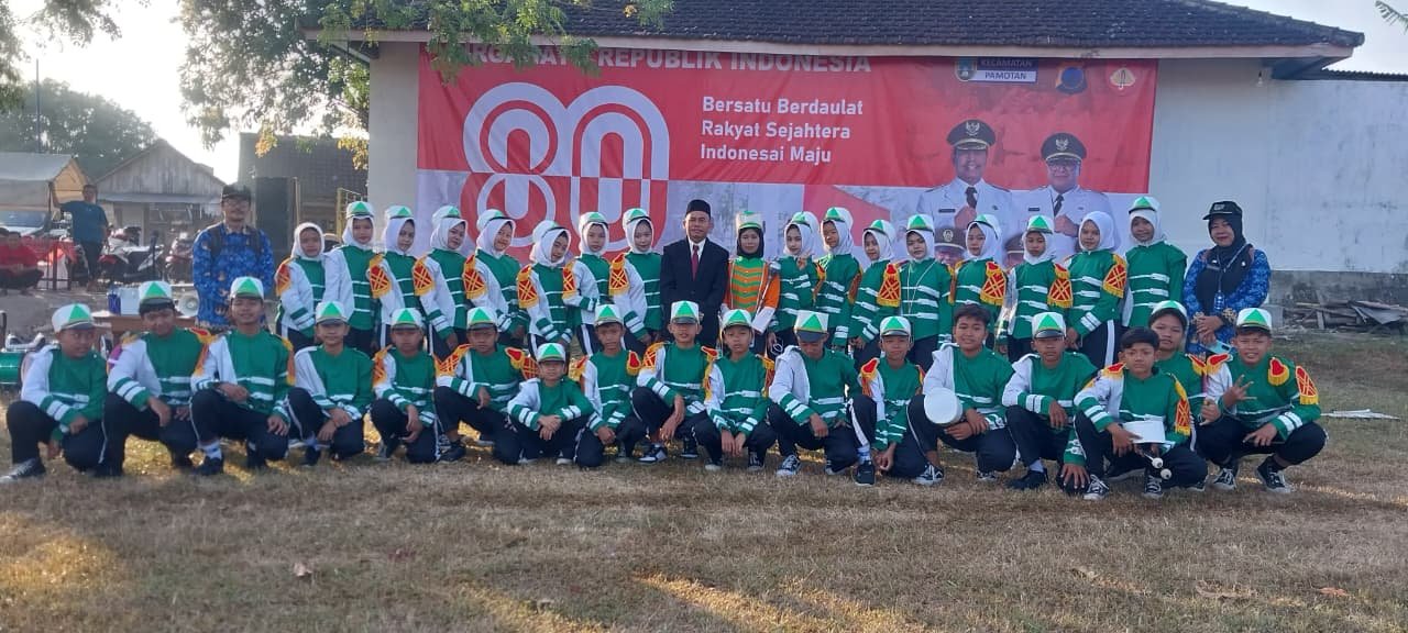 Drumband SMPN 3 Pamotan Iringi Pengibaran Sang Merah Putih di Upacara HUT RI ke-80 Kecamatan Pamotan