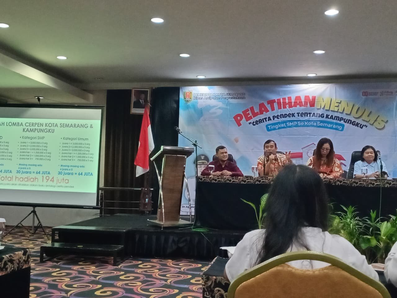 JATENGPOS.CO.ID-Sebanyak 70 siswa setingkat SMP Negeri dan swasta mengikuti pelatihan menulis cerpen di Hotel Grasia (3/9). Kegiatan ini diselenggarkan oleh Dinas Arsip dan Perpustakaan Kota Semarang. Hadir dalam acara tersebut Kepala Dinas Arsip dan Perpustakaan Kota Semarang, FX.Bambang Suronggono, Kepala Dinas Pendidikan Kota Semarang, Dr.Bambang Pramusinto, Anggota Komisi D DPRD Kota Semarang, Kusrin,SE dan 3 narasumber.