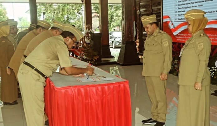JATENGPOS.CO.ID, UNGARAN- Para pejabat struktural di lingkungan Sekretariat Daerah, Dinas Kominfo dan Badan Kesbangpol melaksanakan penandatangan Pakta Integritas pelaksanaan APBD 2026 di Ruang Dharma Satya Kompleks Kantor Bupati Semarang di Ungaran, Selasa (6/1/2026) pagi.