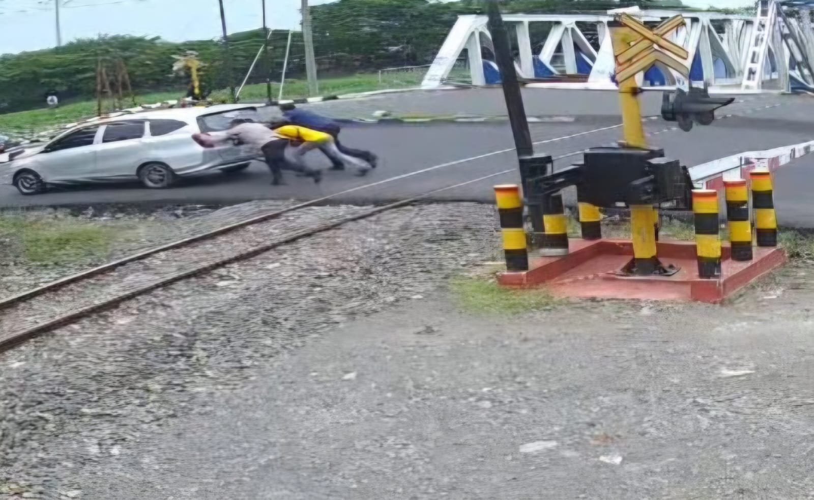 Di tengah perjalanan dinas, dirinya sigap mendorong mobil yang mogok tepat di atas lintasan rel kereta api, sesaat sebelum kereta melintas.