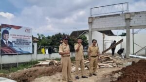 Kepala Desa Kesongo Supriyadi (kiri) bersama perangkat di halaman pembangunan gedung KDMP Kesongo yang mulai pengerjaan dinding, Rabu (21/1/2026). FOTO: MUIZ/JATENGPOS