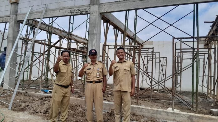 Kepala Desa Kesongo Supriyadi (kiri) bersama perangkat di halaman pembangunan gedung KDMP Kesongo yang mulai pengerjaan dinding, Rabu (21/1/2026). FOTO: MUIZ/JATENGPOS