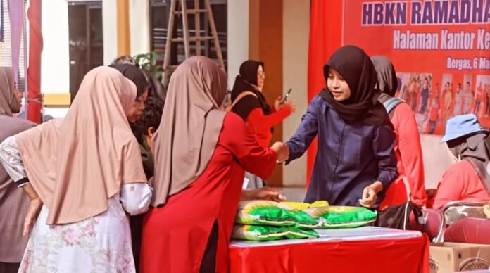 JATENGPOS.CO.ID, UNGARAN- Seratusan warga menyerbu pasar murah kebutuhan pokok yang digelar Dinas Pertanian Kabupaten Semarang di halaman Kantor Camat Bergas, Jumat (6/3/2026) pagi.