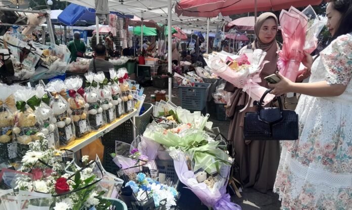 Syaifullah (38) warga Wonosari, Kota Semarang, salah satu pedagang berupaya menangguk untung. Ia datang dengan menjajakan hasil karyanya mulai dari bucket boneka, bunga kering, bunga segar hingga bucket berhias lembaran uang rupiah. Masing-masing bucket dikemas plastik berpita dan kotak mika yang unik.