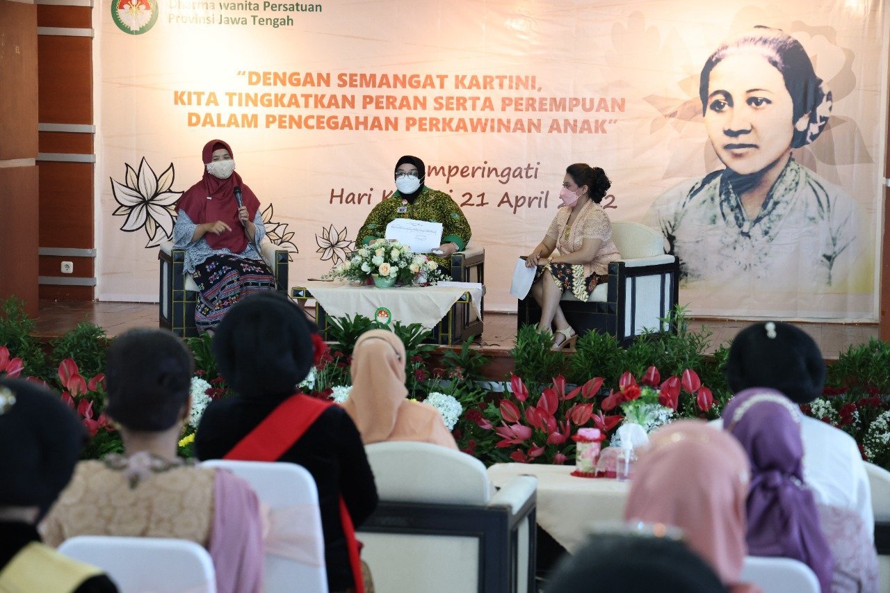 Pernyataan tersebut disampaikan dalam peringatan Hari Kartini bersama Dharma Wanita Persatuan (DWP) dan kalangan perempuan dengan tema Semangat Kartini Kita Tingkatkan Peran Serta Perempuan dalam Pencegahan Perkawinan Anak, di Aula Gedung DWP Jateng, Jumat (22/4/2022).