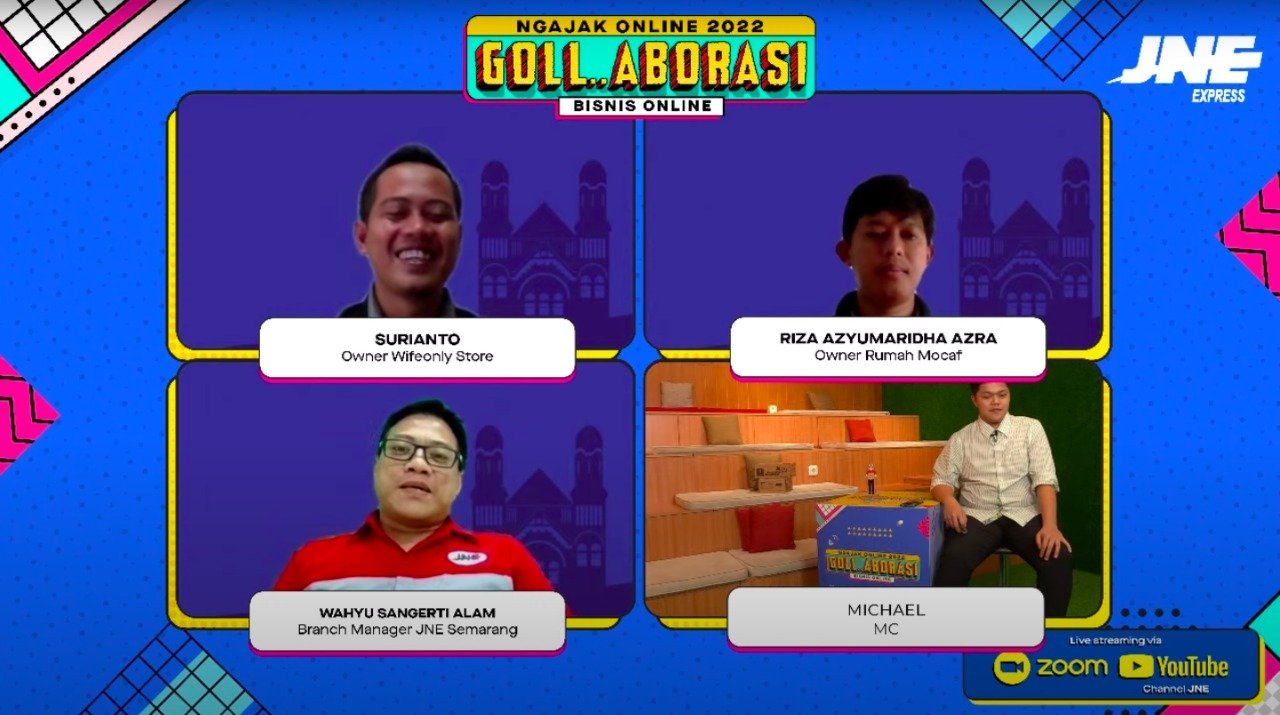 Perhelatan ini mengumpulkan lebih dari 200 pegiat UKM Semarang secara virtual dengan tiga narasumber, Wahyu Sangerti Alam selaku Branch Manager JNE Semarang, Riza Azyumaridha Azra selaku Owner Rumah Mocaf, dan Surianto selaku Owner Wifeonly Store. Wahyu selaku Branch Manager JNE Semarang membuka gelaran ini, berharap UKM di Indonesia khususnya Semarang mampu berkembang dan bersaing di dunia digital, baik di skala nasional maupun global.