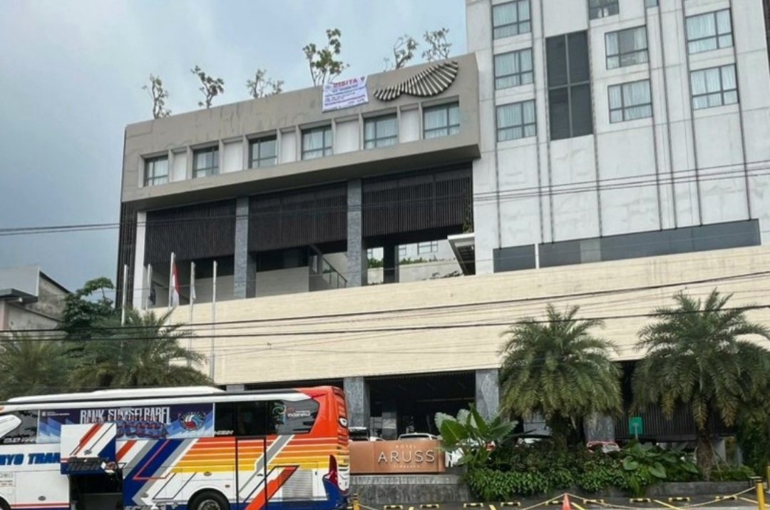 Dari pantaun JATENG POS di Hotel Aruss Jalan dr Wahidin Semarang, telah terpampang spanduk besar yang bertuliskan “Disita Bareskrim Polri Berdasarkan Penetapan PN Semarang Nomor 1580/Penpid.B-SITA/2024/PNsmg”. Spanduk tampak di atap gedung hotel dan depan lobi hotel berbintang tersebut.
