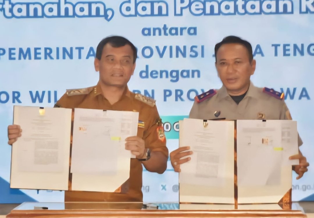 JATENGPOS. CO. ID, SEMARANG – Pemerintah Provinsi (Pemprov) Jawa Tengah dan Kantor Wilayah Badan Pertanahan Nasional (BPN) setempat, menandatangani nota kesepakatan soal sinergi penyelenggaraan urusan pertanahan, agraria, dan penataan ruang.
