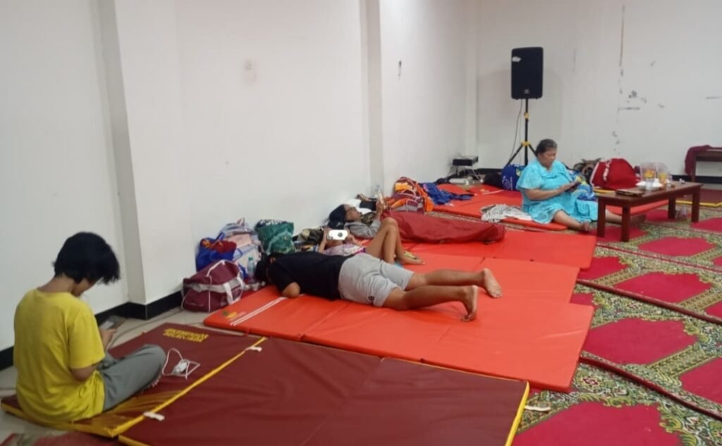 “Saya mengungsi ke sini karena takutnya tambah naik gitu. Kayaknya juga masih mendung hujan. Jadi, saya sama keluarga ngungsi aja ke sini, sekitar maghrib,” ujarnya.